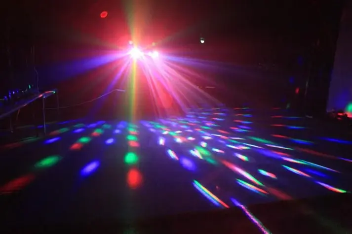 The two RGBW derby effect disco light onto the dance floor or on the wall, and acombined UV / stroboscope bar produces black light and flashes