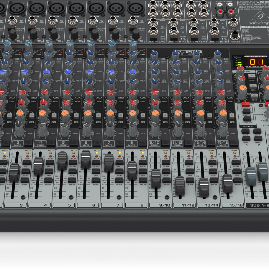 The feature-packed XENYX X2222USB mixer allows you to effortlessly achieve premium-quality sound thanks to 8 onboard studio-grade XENYX Mic Preamps, and Behringer's ultra-musical “British” channel EQs – with a semi-parametric mid band for the ultimate in sound sculpting. Easy-to-use “one-knob” compressors provide total dynamic control for the ultimate in punch and clarity, while respecting all the power and emotion you pack into every note. Add to this a 24-bit, dual-engine Multi-FX processor with 16 editable, professional-grade presets including reverb, chorus, flanger, delay, pitch shifter and multi-effects – and the X2222USB becomes an incredibly versatile mixer for your live performances.