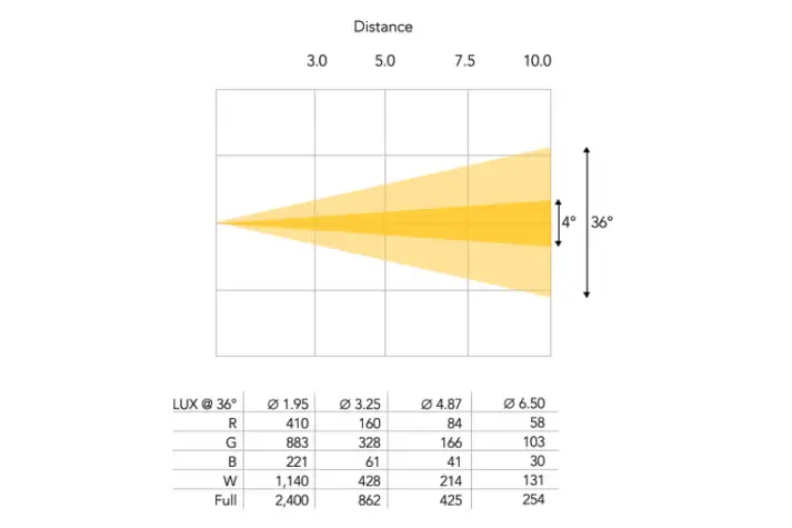 - Output: 7000lumen 43000lux @ 3M RGBW at 4°
